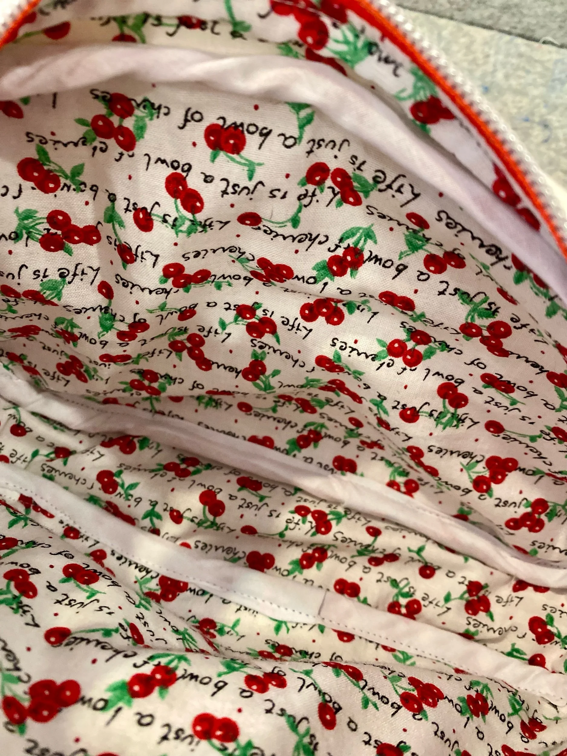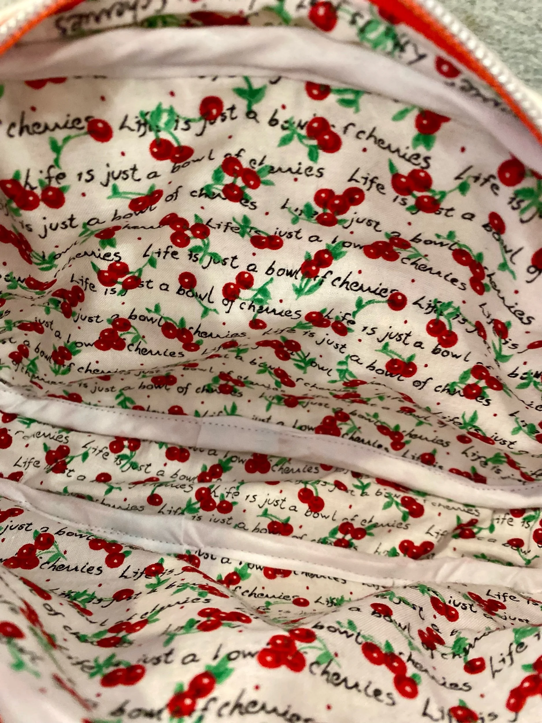 Inside liner fabric is white with cherries. 1 side the pattern is upside down