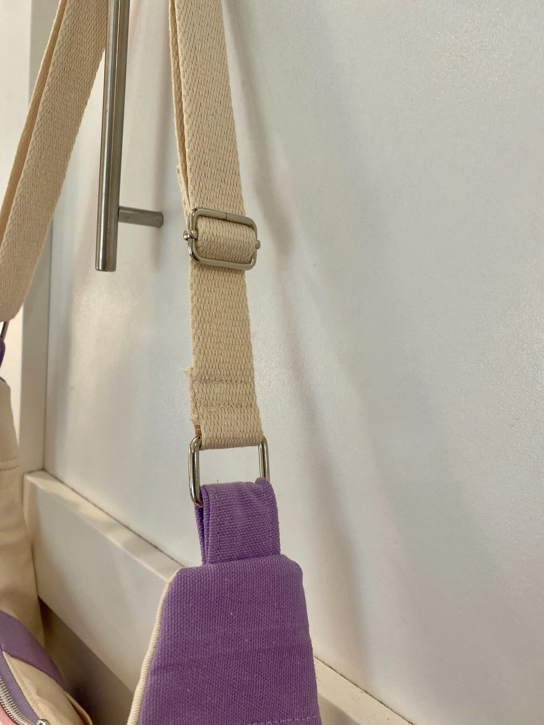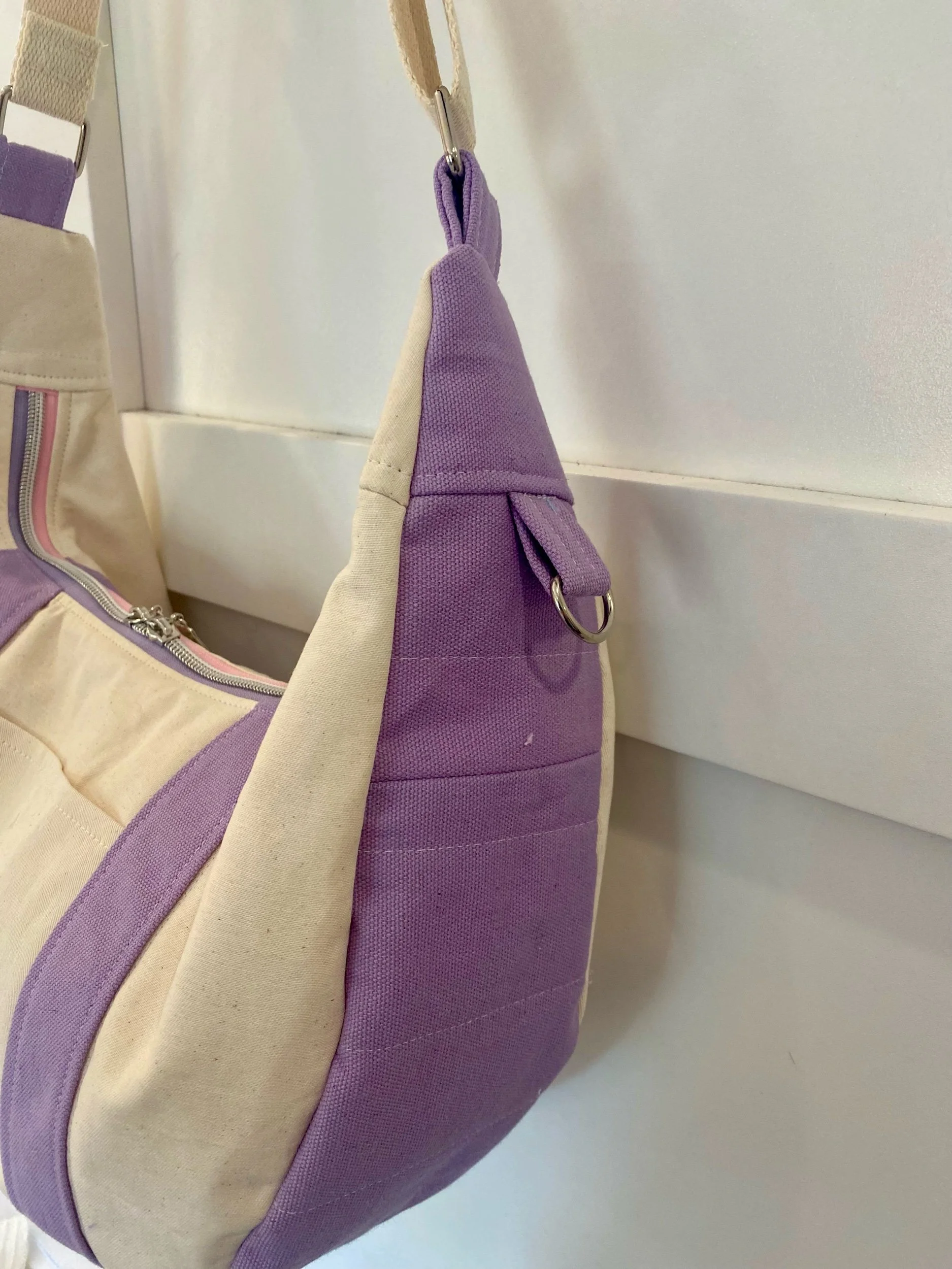 Trader Joe’s bag is taken all apart and sewn back together to make this crescent shaped bag. Handmade so there might be a few imperfections, please check pictures before purchase.