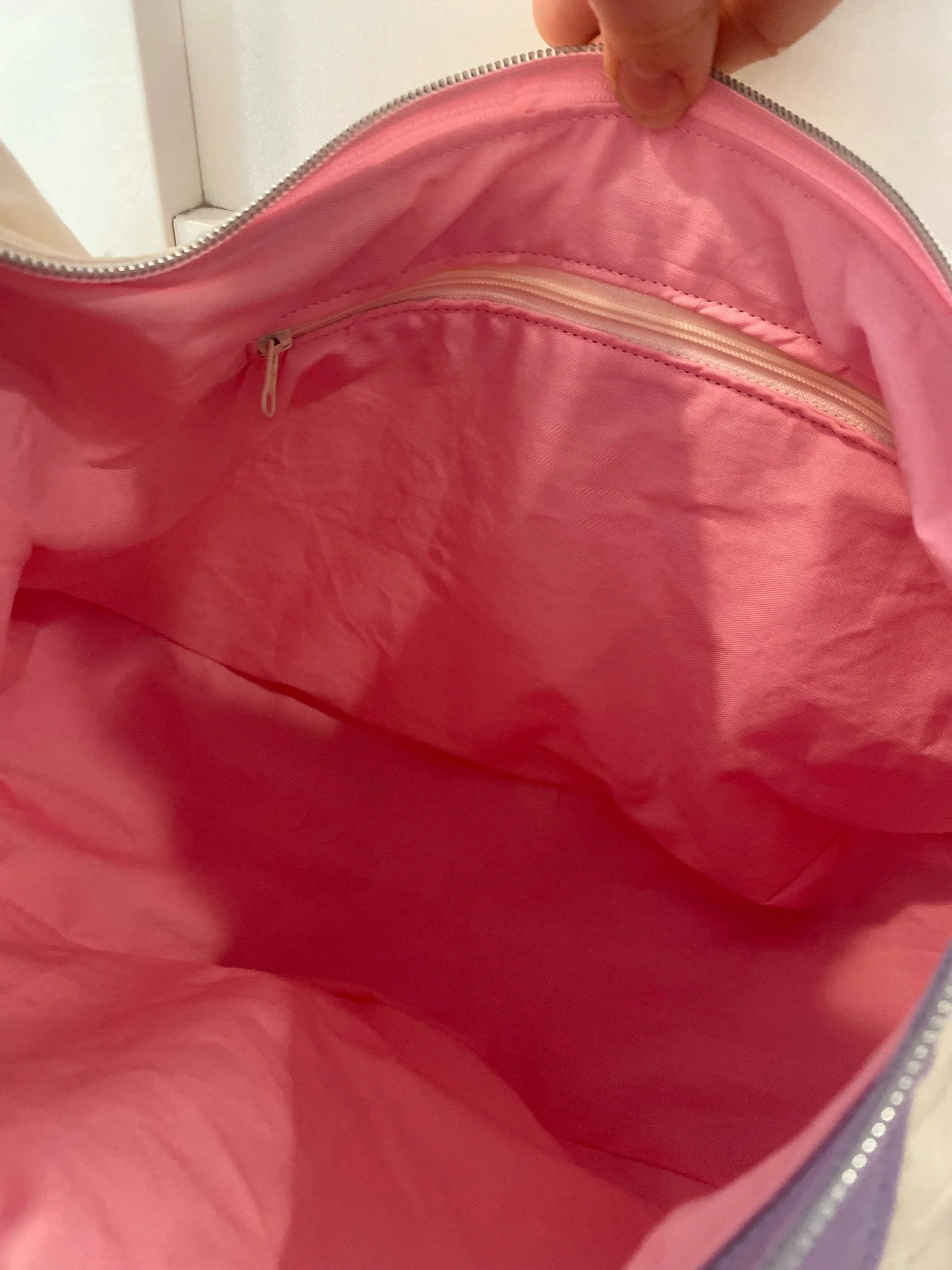 Fully lined interior. Fabric is pink to match the logo