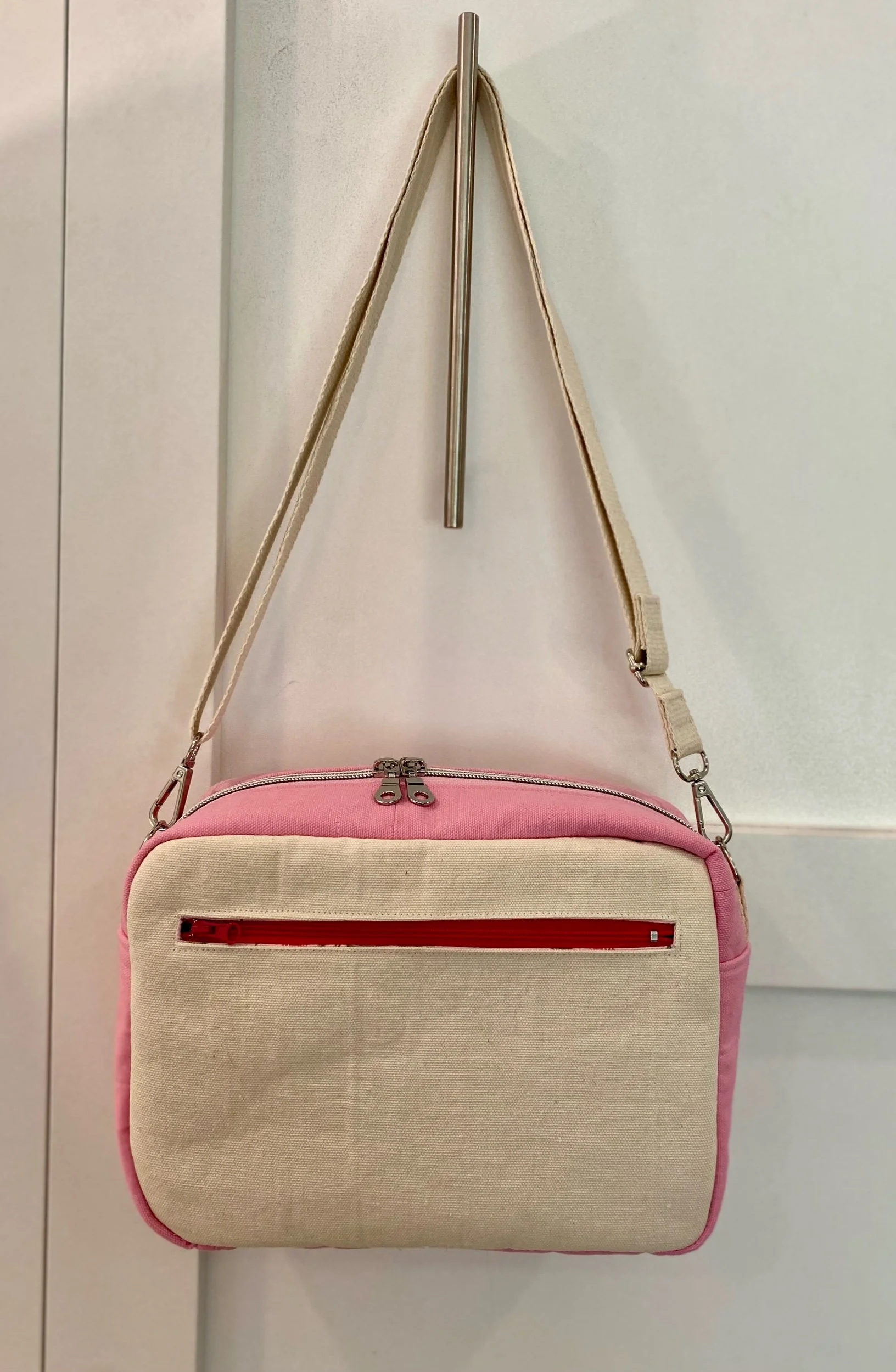 Exterior back pocket with a Dark Pink Zipper