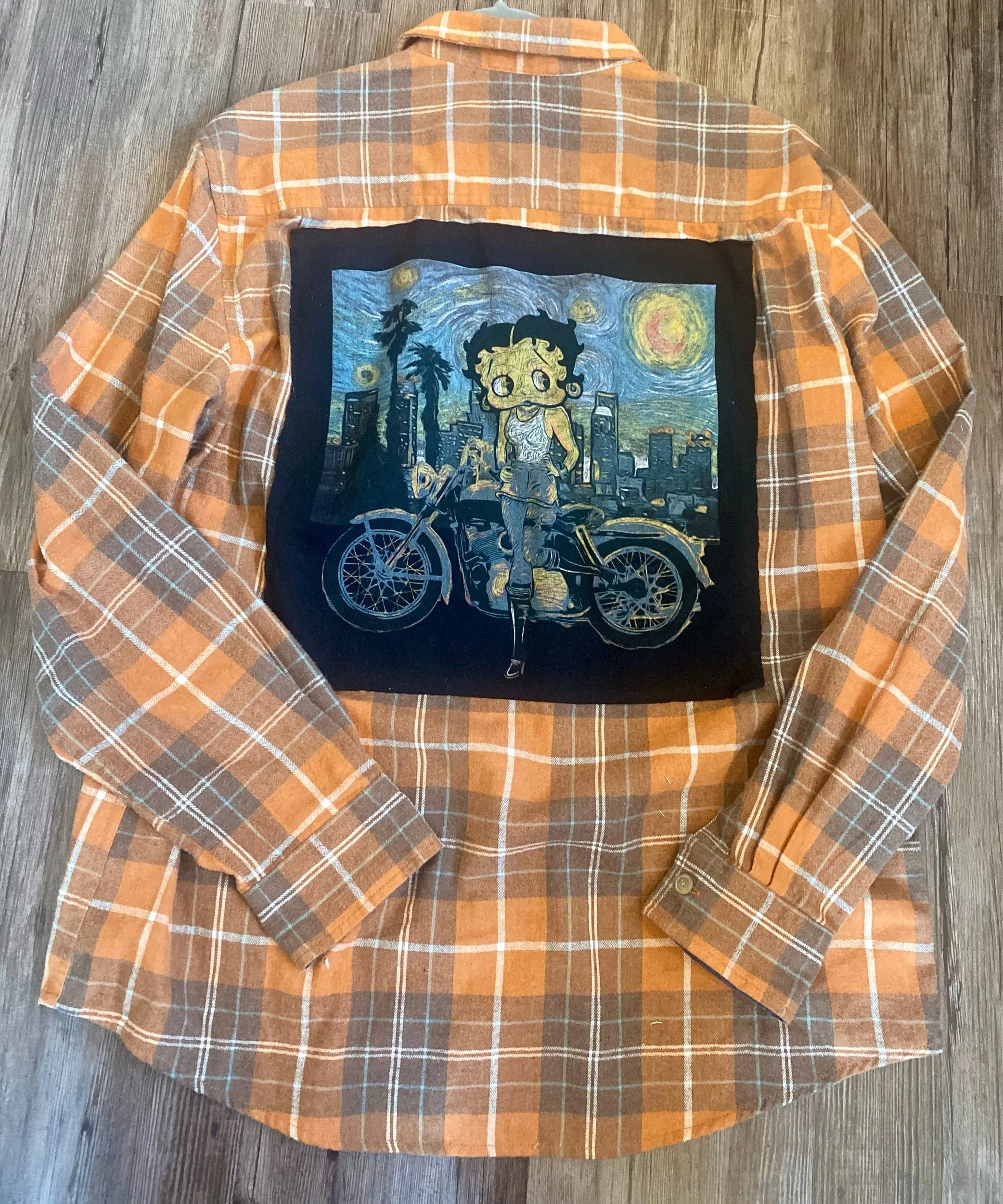 I only use shirts and flannels that are thrifted. Shirt is ironed to flannel then sewn in place. Washed before sold. All items are One Of A Kind. Let me know if you are looking for a different size or color, I might have more shirts available to make you one similar.