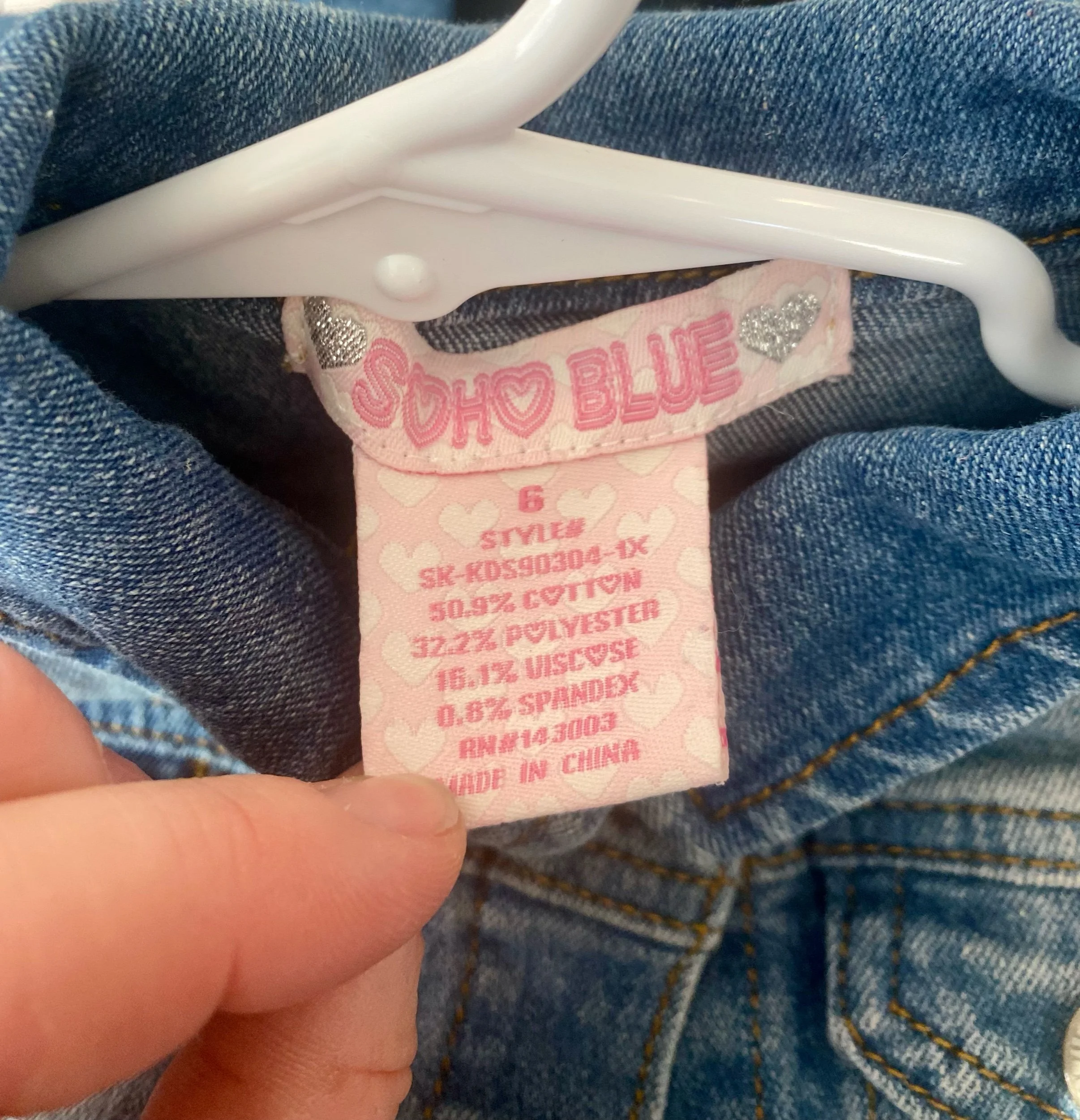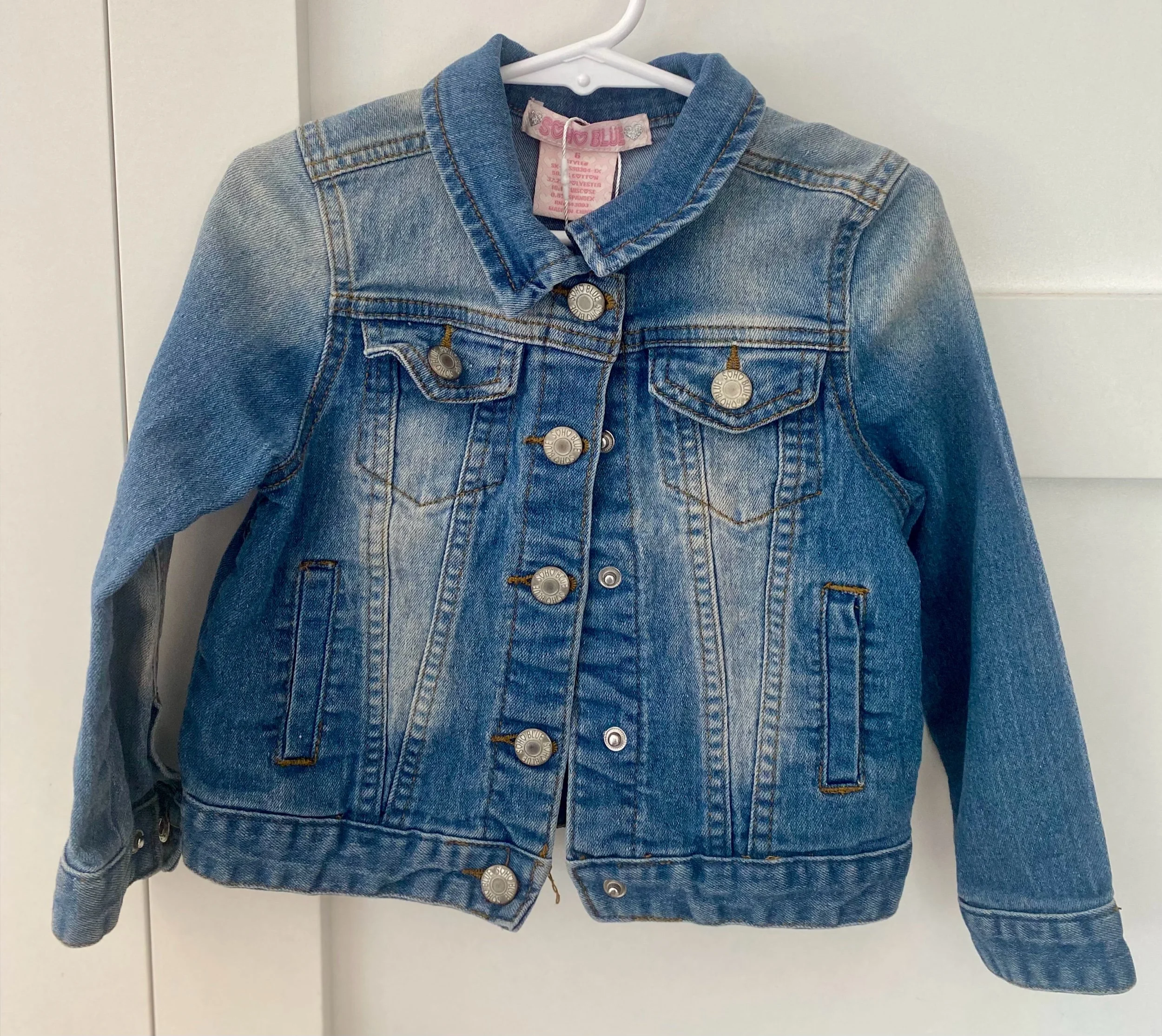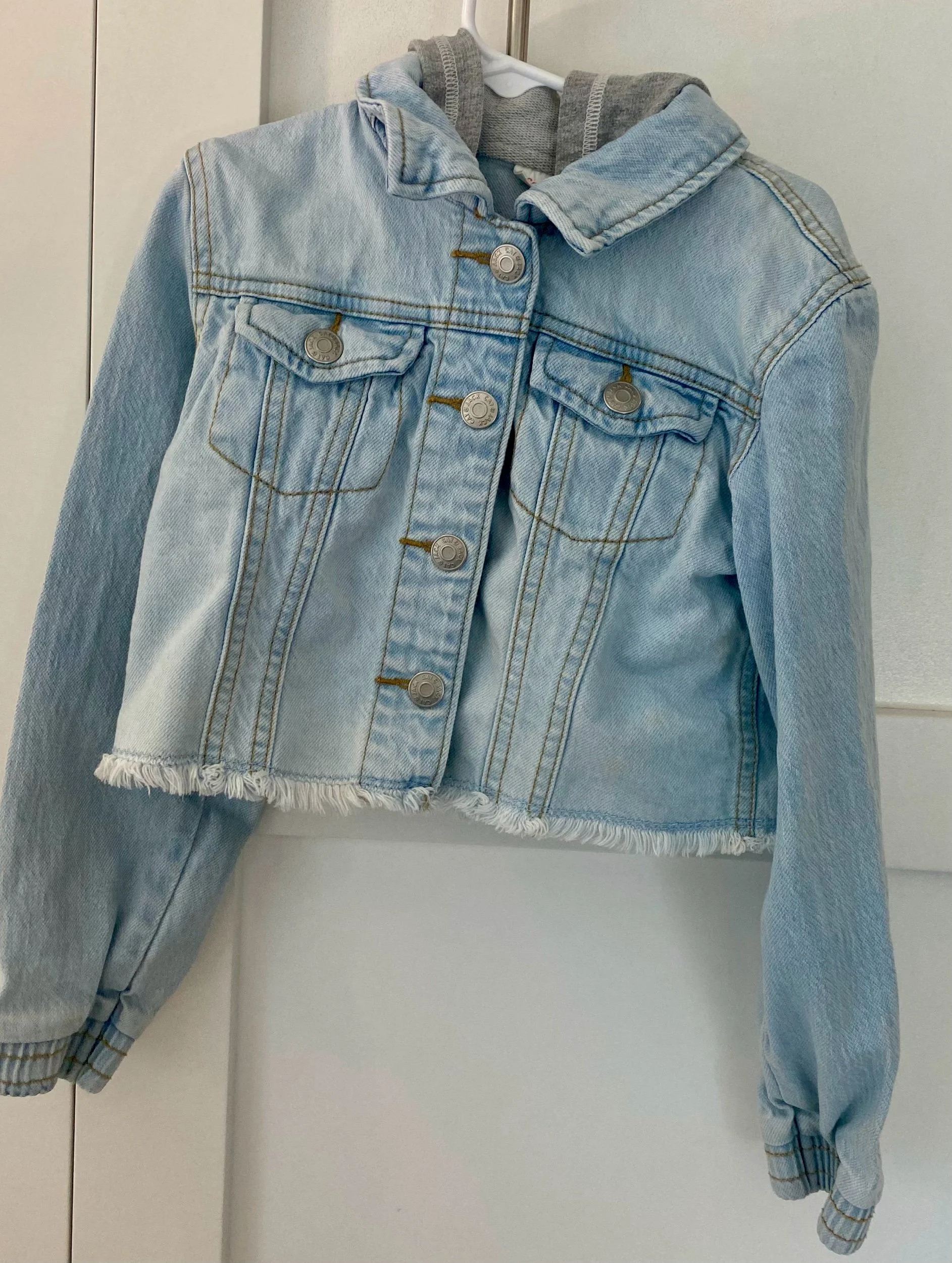 Made from a T Shirt and a Denim jacket are from a thrift shop so they are both used. Jacket has some gems on the front and a frayed bottom.