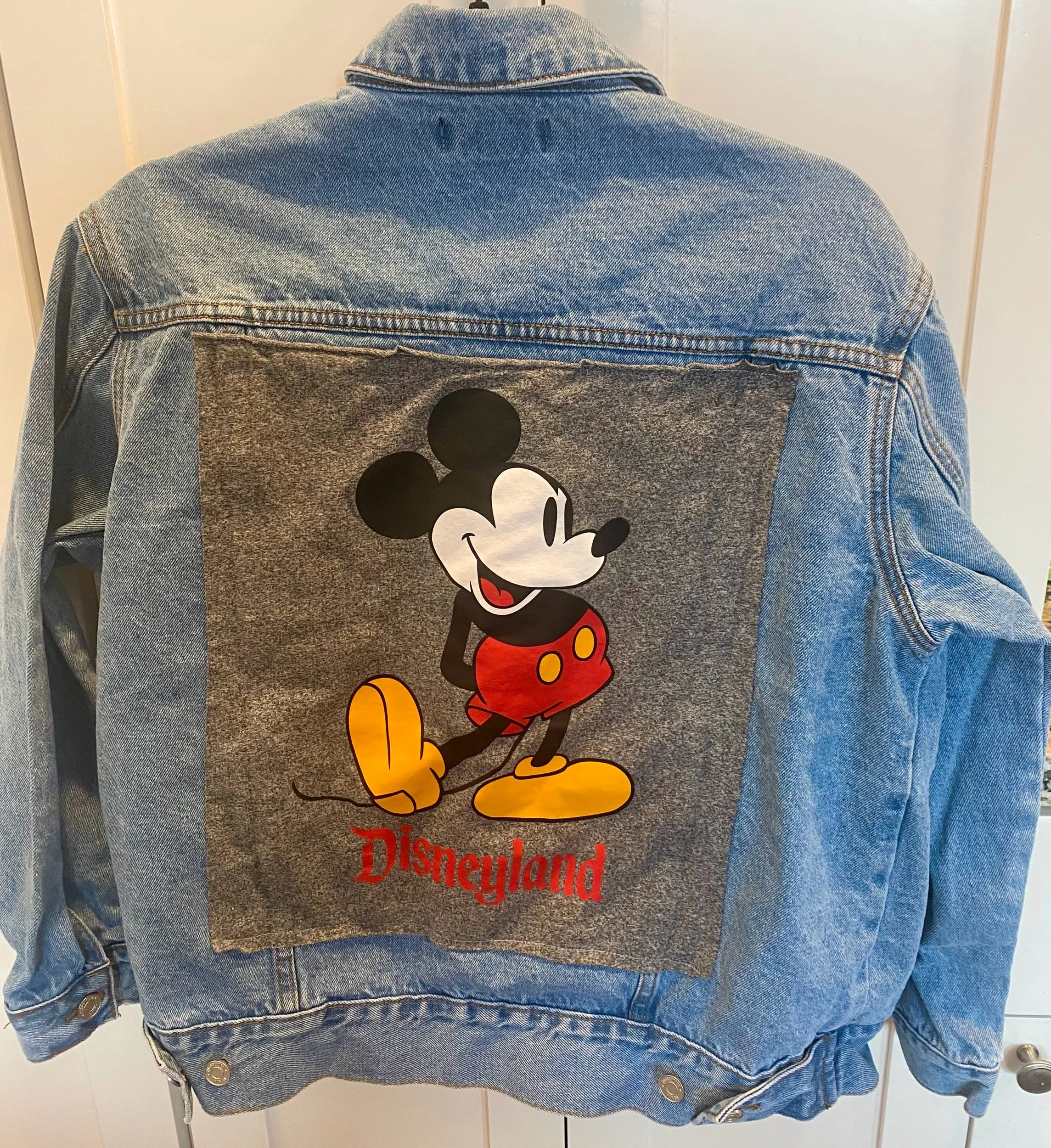 Made from a T Shirt and a Denim jacket are from a thrift shop so they are both used. Jacket has some gems on the front and a frayed bottom.